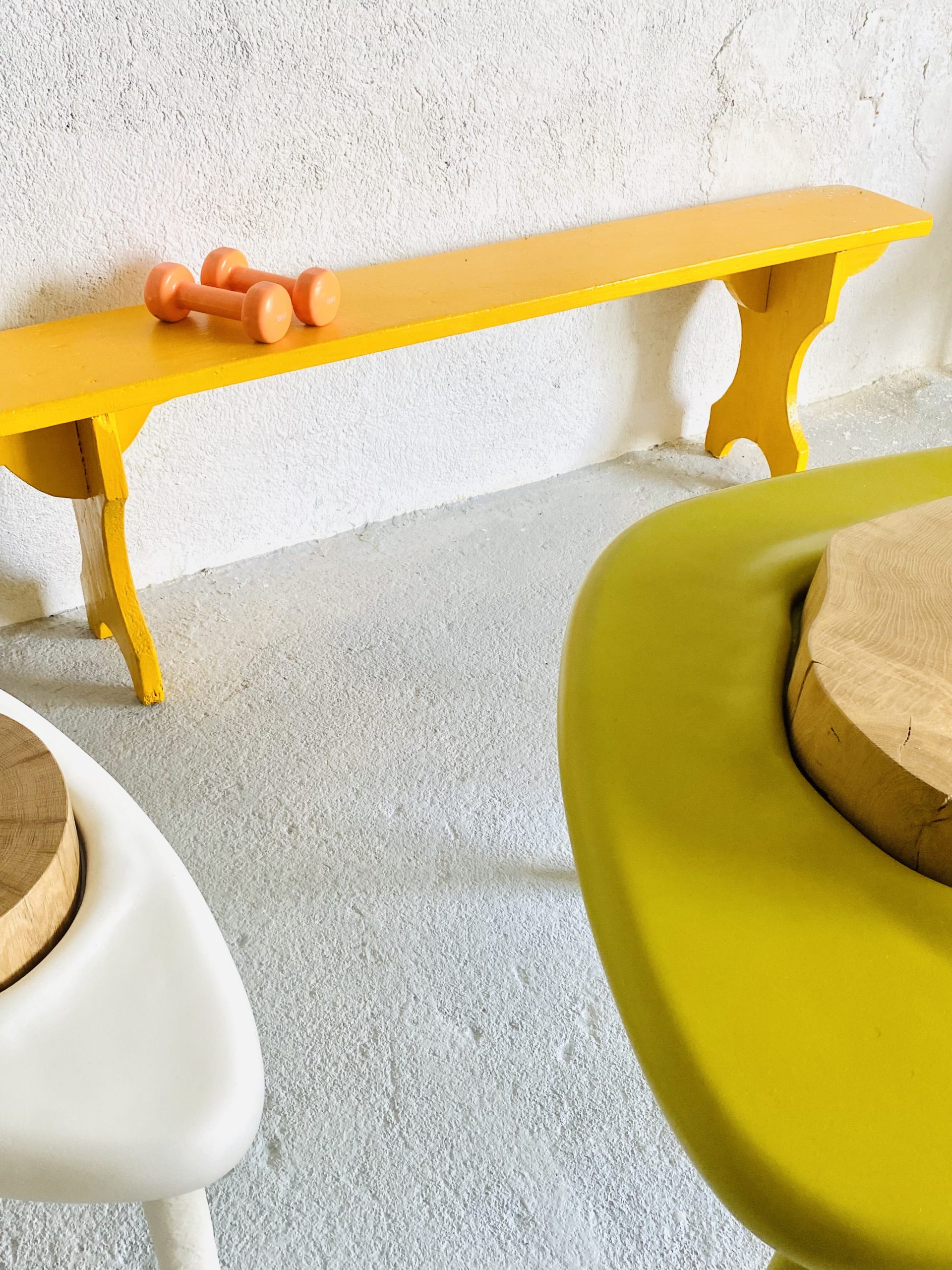 Un banc customisé couleur orange reprenant la couleur d’un élément de décoration gélule.