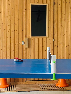 Réalisation d’une table de ping-pong bleu électrique pour rester dans des coloris « punchy » et l’aménagement de l’espace avec sauna et accesoires de sport , tapis de course etc….
