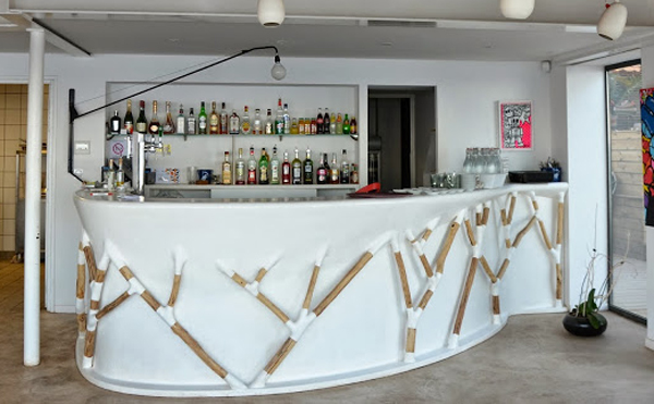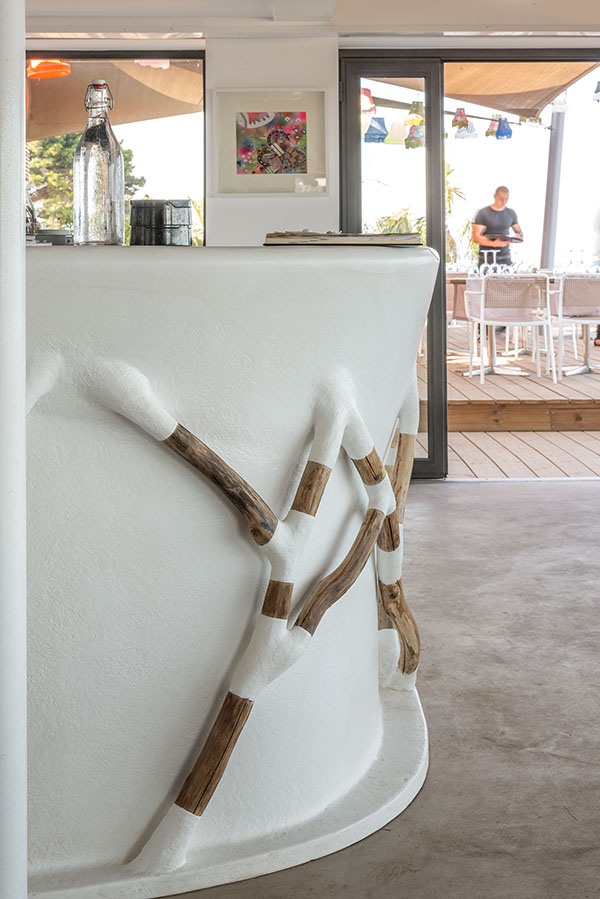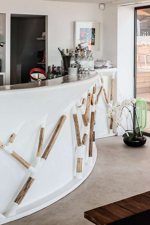 Le bar d’intérieur réalisé par Binôme s’intègre parfaitement dans notre environnement méditerranéen alliant l’usage de matériaux moderne comme la résine et les bois de plage.