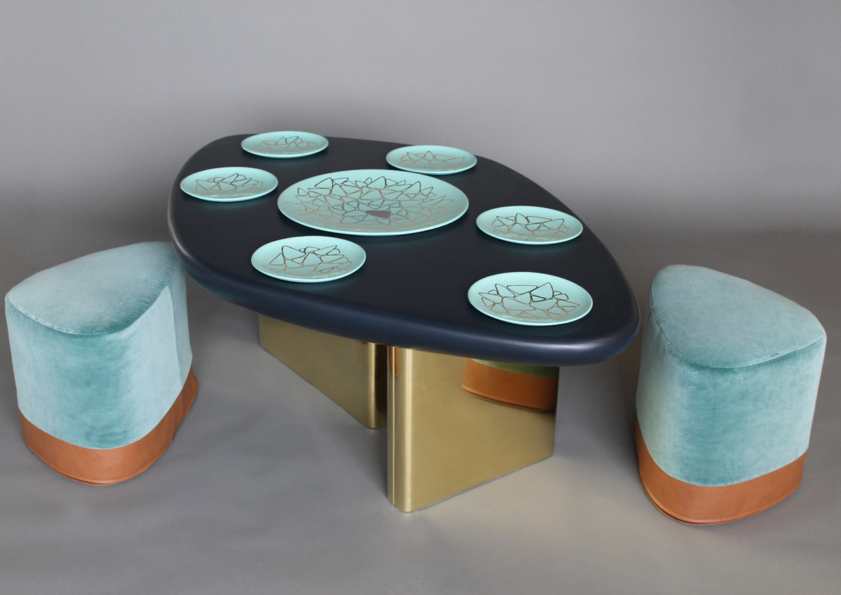 Céleste se veut conviviale, avec ses tabourets reprenant le graphisme des assiettes, celles-ci étant insérées sur le plateau. Elle permet de se retrouver pour diner autour d’un plat central majestueux.