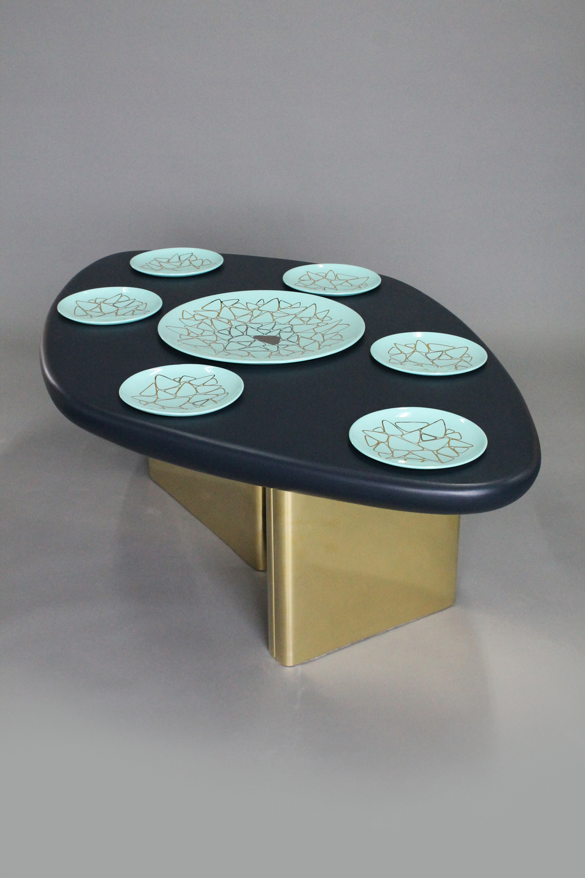 Le graphisme des assiettes aux couleurs dorées viennent se juxtaposer aux piètements en laiton.