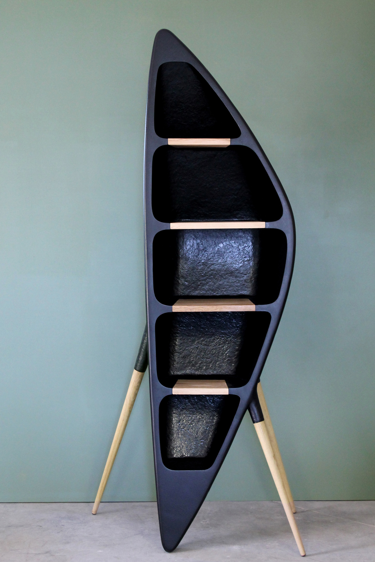 Reprenant les codes de la collection Tripode, cette étagère tel un croissant de lune s’élance sur trois pieds .